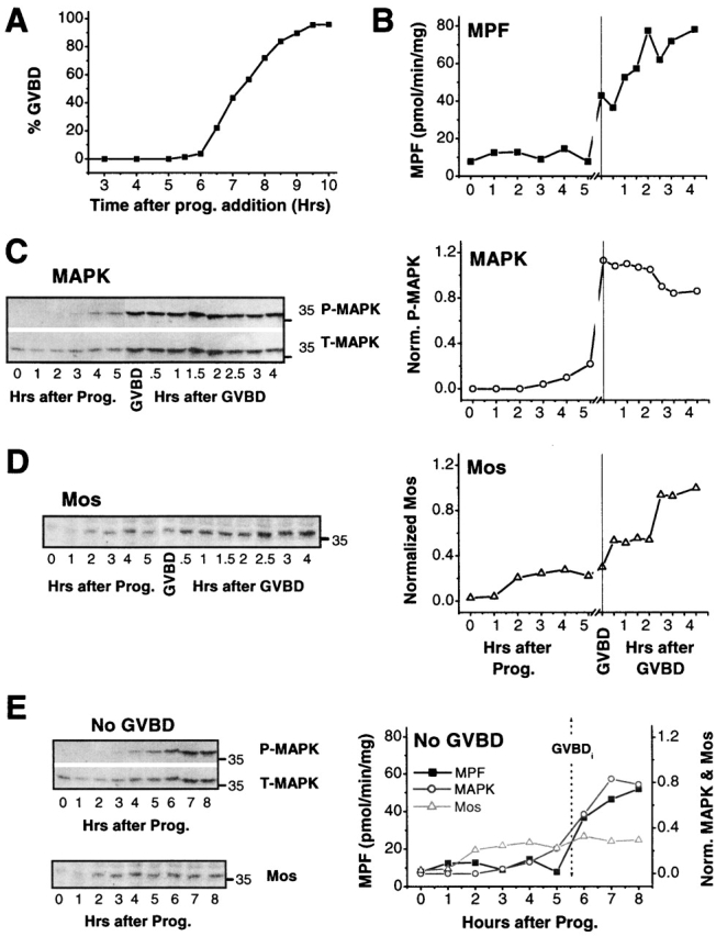 Figure 2. Time course of MPF, MAPK, and Mos activation during progesterone-induced maturation. (A) Time course of GVBD. GVBDi occurred at 5.5 h, and GVBD50 ∼7.25 h after progesterone addition. At each time point, five cells were pooled to quantify kinase activity. (B–D) MPF, P-MAPK, and Mos levels during oocyte maturation. MPF activity was measured as the histone H1 kinase activity as described in Materials and methods. The levels of P-MAPK and Mos were determined by Western blot analysis using a P-MAPK–specific and anti-Mos antibody, respectively, as described in Materials and methods. In the case of MAPK, the same blot was reprobed with an antibody that detects total MAPK (T-MAPK) levels, showing that MAPK was present in the lysates but was not phosphorylated. To be able to compare P-MAPK and Mos levels between different experiments, we always ran a positive control lysate from eggs on every gel, and normalized P-MAPK and Mos levels to that sample. Therefore, Western data for P-MAPK and Mos throughout this manuscript are normalized to the same egg lysate (see Materials and methods for more details). The time scale is divided into two phases: after progesterone addition; and after GVBD. The 35-kD molecular mass marker is shown on the right of the gels. (E) MPF, P-MAPK, and Mos levels in cells treated with progesterone, but that did not undergo GVBD. GVBDi is indicated for reference. This time course of kinase activation is representative of five similar experiments.
