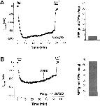 Figure 7. Continuous recording of ISOCE through the GVBD transition. (A) Prolonged recording of ISOCE from a control untreated oocyte. MPF activity in this cell is also shown. (B) ISOCE was activated in a progesterone-treated oocyte before GVBD and continuously recorded until, and past, the time point at which GVBD occurred (arrow). At the end of the experiment, the cell was lysed in extraction buffer and MPF activity was measured. This cell had high MPF activity, indicating that the prolonged recording did not interfere with MPF activation at GVBD. MPF activation at GVBD is not able to block ISOCE that has been preactivated before GVBD.