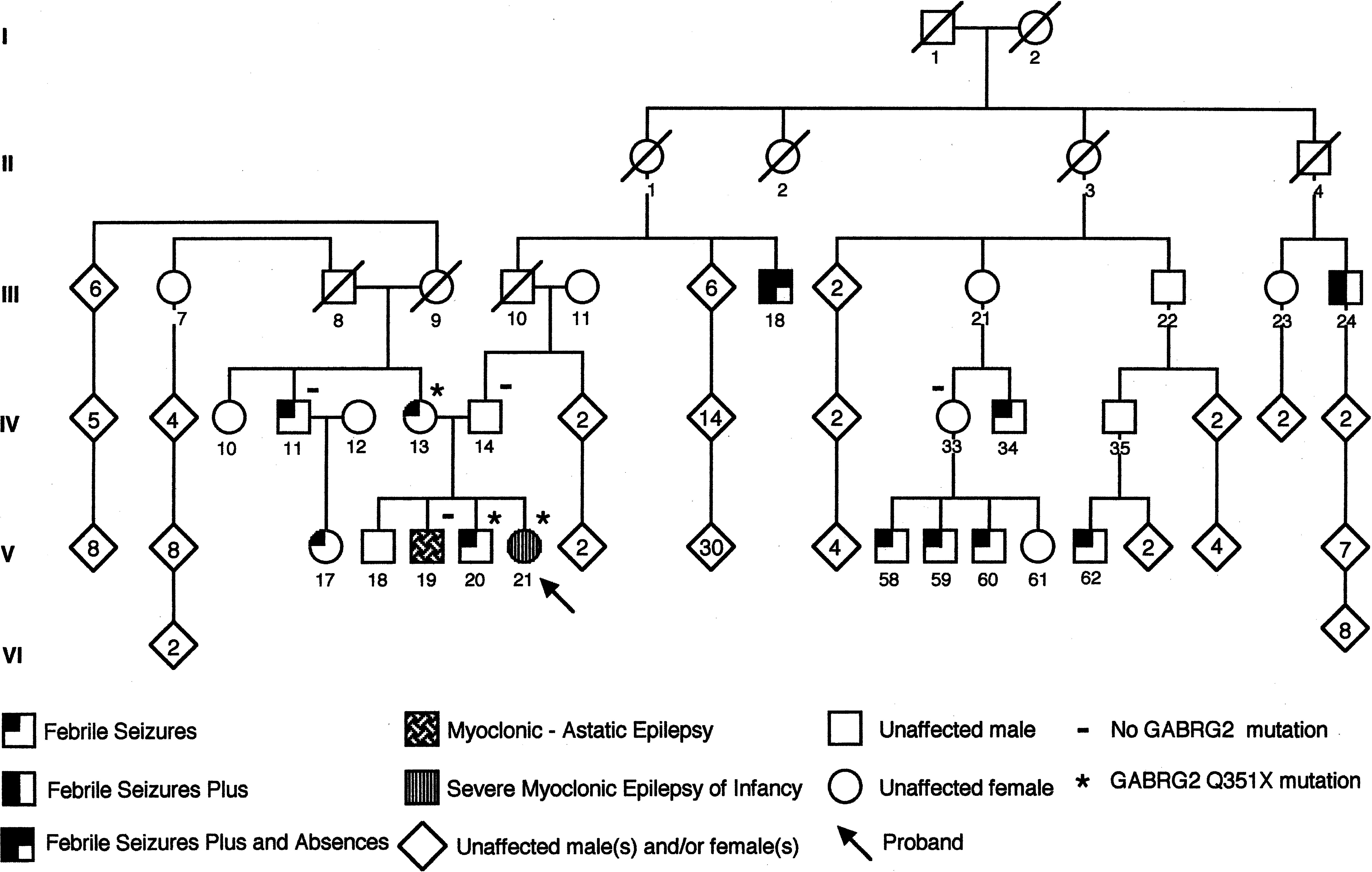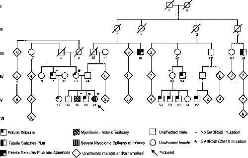 Figure 1. Pedigree of an Australian family with GEFS+. An asterisk (*) indicates members carrying the Q351X mutation in GABRG2, and a minus sign (−) indicates members who were tested and are negative for the Q351X mutation.