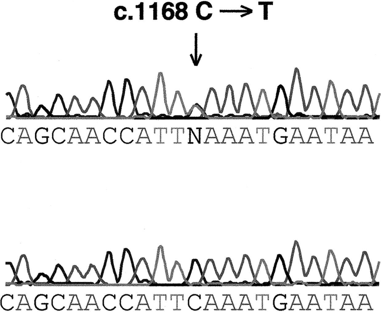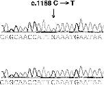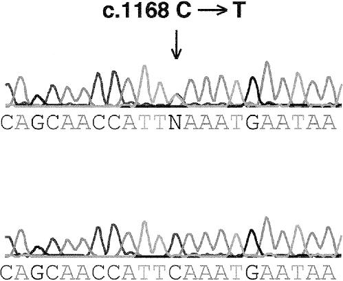 Figure 2. Sequencing trace of a portion of exon 9 GABRG2, showing the c.1168C→T transition (arrow). The upper chromatogram shows the mutation, and the lower chromatogram shows the control sequence.