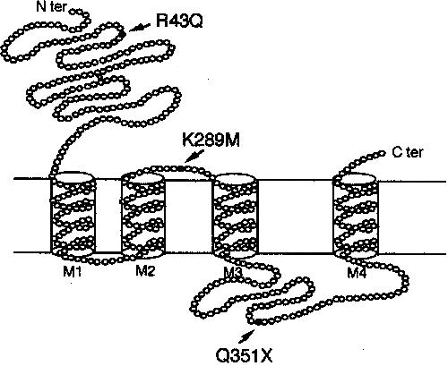 Figure 3. Schematic representation of the GABRG2 protein, with arrows indicating the positions of mutations associated with epilepsy.
