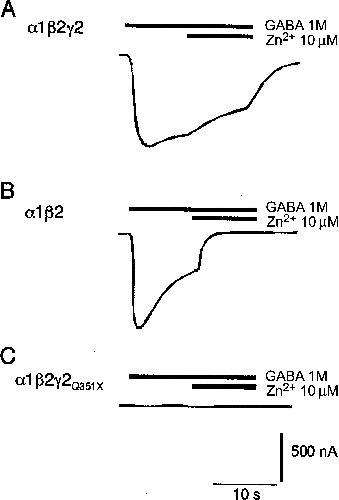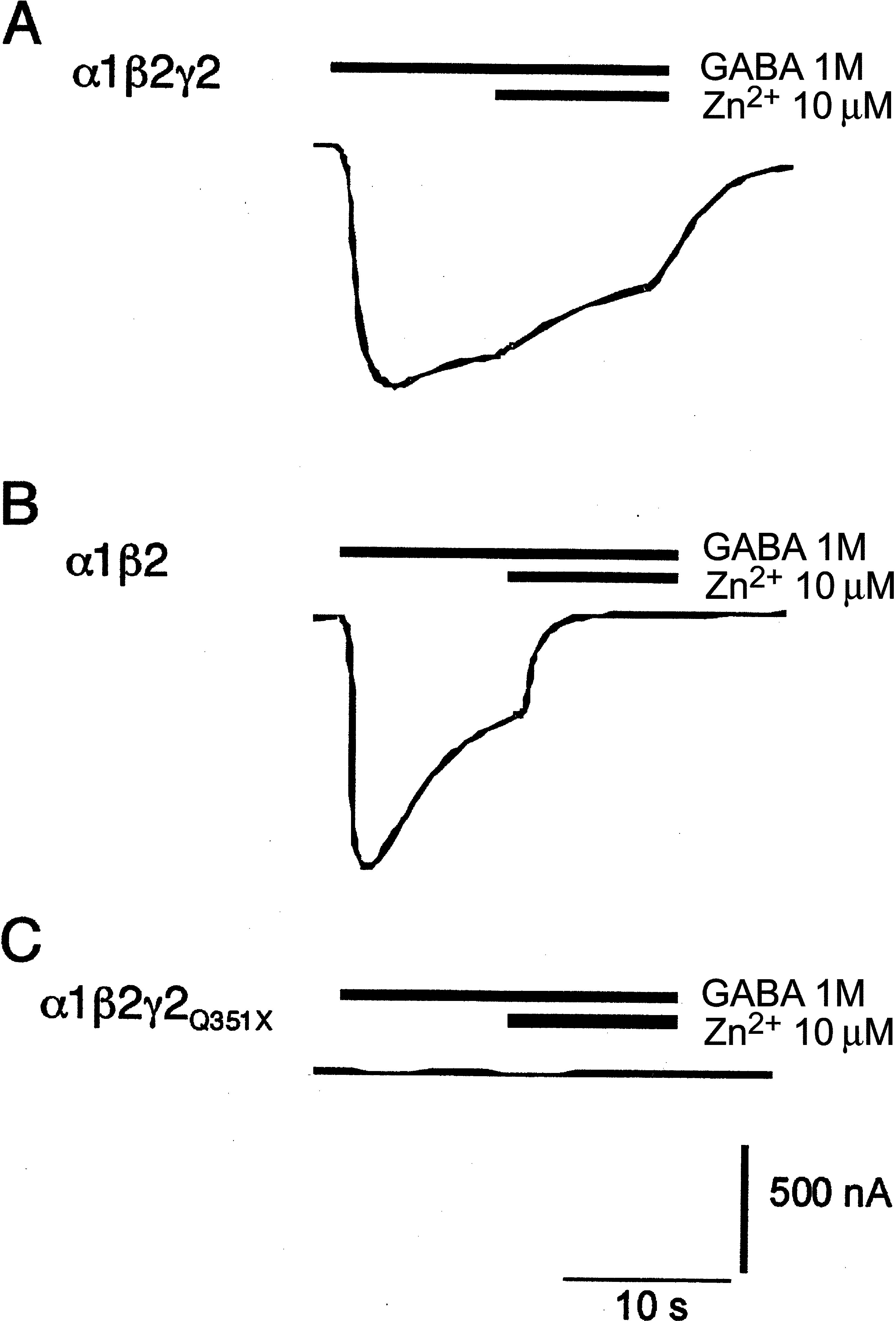 Figure 4. Two-electrode voltage-clamp recordings in oocytes, demonstrating that coexpression of the GABRG2Q351X abolishes the response to GABA. For all recordings, n=6. The current and time scale bars apply to all traces. Holding potential was −80 mV. A, Injection of oocytes with wild-type GABRA1:GABRB2:GABRG2 cRNAs (1:1:10 ratio, to favor assembly of γ subunit–containing complexes), resulting in both a robust inward current response to GABA and a low sensitivity to Zn2+ blockade, characteristic of GABRG2 coexpression. B, Expression of GABRA1:GABRB2 only (1:1 ratio). This also produced robust responses to GABA, but with high sensitivity to blockade by Zn2+. C, Expression of GABRA1:GABRB2:GABRG2Q351X subunits (1:1:10 ratio), abolishing GABA-induced currents.