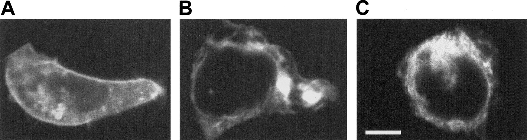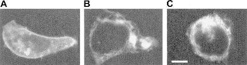 Figure 5. Imaging of GFP-tagged GABRG2 expressed with GABRA1 and GABRB2 subunits, revealing the fate of GABRG2Q351X-containing receptors in HEK293 cells. Images were obtained by confocal fluorescence microscopy (excitation, 488 nm; emission, >515 nm). The scale bar in panel C corresponds to 5 microns and applies to all three panels. A, EGFP-tagged wild-type GABRG2 subunit, found in both the membrane and the intracellular compartment (n=20 individual cells analyzed). B, EGFP-tagged GABRG2Q351X, found only in the intracellular compartment (n=20 individual cells analyzed). C, ER-targeted EYFP expression, demonstrating subcellular distribution of ER that is remarkably similar to that seen in B.