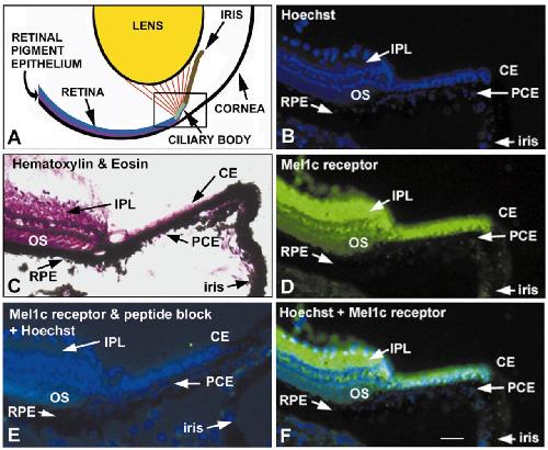 dye. (C) Retina and ciliary body stained with the hematoxylin and eosin. (D) Same section as in (B) labelled with the Mel1c
