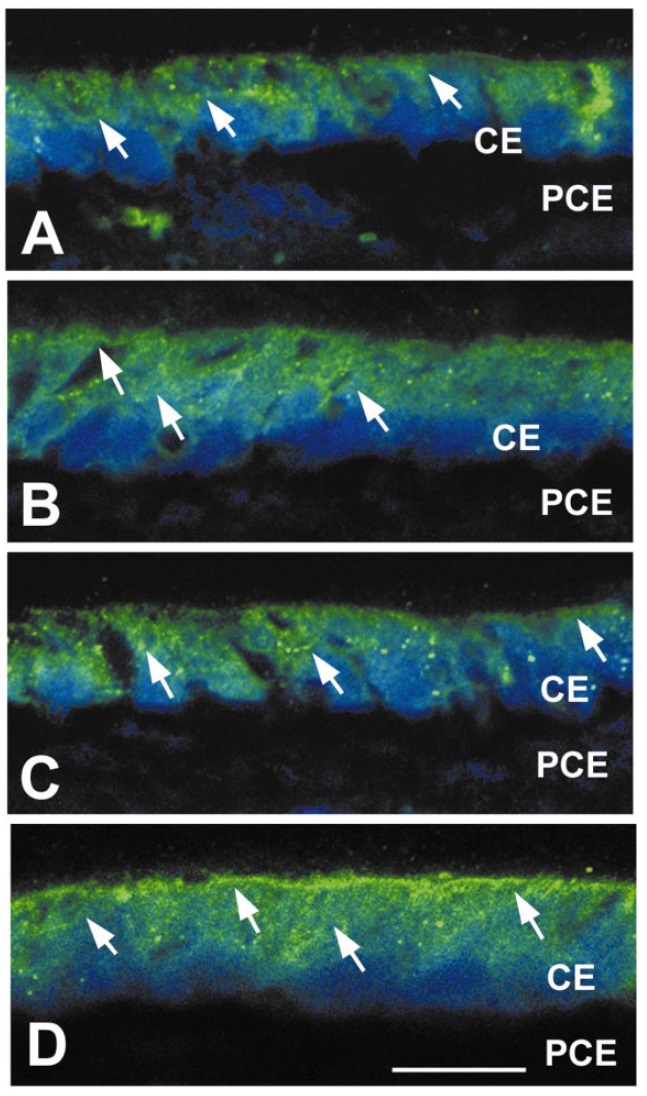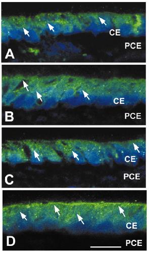 over cells of the nonpigmented ciliary epithelium (CE). (B)