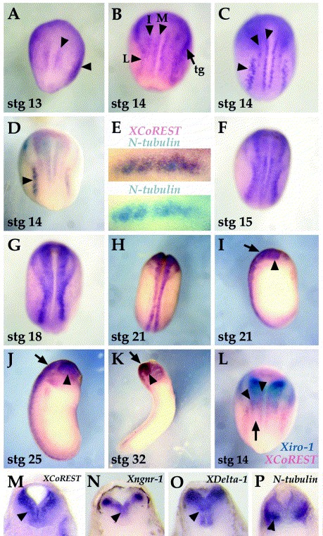 Fig. 2. Expression of XCoREST during Xenopus development. (A) At the beginning of neurulation (stage 13), XCoREST mRNA is localized in two stripes of cells at each side of the midline (arrowheads). (B) At stage 14, the expression of XCoREST is detected in three stripes (M, medial; I, intermediate and L, lateral stripes; arrowheads) at each side of the midline and in the trigeminal placode (tg). (C) N-tubulin is expressed in a similar three-stripe pattern (arrowheads). (D) Double in situ hybridization for XCoREST (purple) and N-tubulin (cian) mRNAs. (E) Upper panel shows a higher magnification of the stripe pointed at with an arrowhead in (D). Lower panel shows the same stripe of the same embryo after the first chromogenic reaction for N-tubulin detection (cian) and before the second chromogenic reaction for XCoREST detection (purple). (FâH) XCoREST expression at different neurula stages. (IâK) Lateral views. (I) At stage 21, XCoREST mRNA is also detected in the eye (arrowhead) and brain (arrow). This expression is also seen at later stages (J and K). (L) Double in situ for XCoREST (pink) and Xiro1 (cian) mRNAs. Note that XCoRESTmedial and intermediate stripes (arrowheads) are at the border of Xiro1 expression domains (arrow). (MâP) Hindbrain transverse sections of tailbud embryos showing XCoREST (M), Xngnr-1 (N), XDelta-1 (O) and N-tubulin (P) domains of expression (arrowheads).