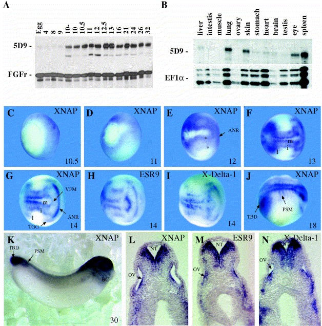 Fig. 3. XNAP mRNA expression during embryogenesis and in adult organs. (A,B) XNAP mRNA expression during embryogenesis and in adult tissues analyzed by RNAase protection. FGFr or EF-α are used as internal controls. (CâN) Whole-mount in situ analysis of XNAP expression during Xenopus early embryogenesis. NieuwkoopâFaber stages of embryogenesis are indicated. All embryos are shown with anterior to the right. (CâF) Dorsal view; (GâI) dorso-anterior view; (J,K) lateral view. (LâN) Transversal section at the level of the otic vesicles of embryos stained with XNAP, ESR9 or X-Delta-1. The stripes of XNAP expression in the posterior neural plate are indicated by asterisks in (E) and are labeled l (lateral), i (intermediate) and m (medial) in (F,G). Abbreviations: ANR, anterior neural ridge; BC, branchial crest segment; NT, neural tube; OV, otic vesicle; PSM, presomitic mesoderm; TBD, tailbud domain; VFM, ventral fore and midbrain.