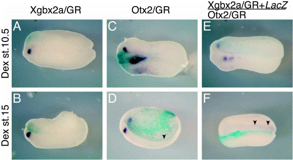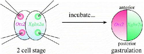 Fig. 1. Establishing an artificial boundary between Xgbx2a and Otx2 â experimental design. Xenopus embryos were injected at the two-cell stage with Otx2/GR RNA in one cell and Gbx2/GR mRNA in the other. This injection scheme establishes a novel boundary between Otx2 and Gbx2 expression domains along the dorsal midline of the embryo.