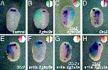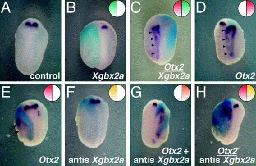 Fig. 2. Otx2 induces broad ectopic expression of En2, while Xgbx2a inhibits it. Embryos were injected unilaterally with RNA encoding Xgbx2a/GR, Otx2/GR or both, according to the scheme in Fig. 1. In all cases, LacZ RNA was co-injected with one of the RNAs to positively determine the mRNA injected in each side. The hormone-inducible proteins were activated at stage 11. Embryos were harvested at stage 18 and processed for double in situ hybridization with En2 (magenta) and LacZ probes (turquoise). The injection scheme based on Fig. 1 is marked in each panel; Otx2 RNA, red; Xgbx2 mRNA, green; Xgbx2 antisense RNA, yellow; Otx2 mRNA+Xgbx2a antisense RNA, orange. (A) Control embryo. (B) Embryo injected unilaterally with Xgbx2a/GR RNA exhibits inhibition of En2 on the injected side. (C) Embryo injected with Xgbx2a/GR and Otx2/GR RNA in adjacent cells shows En2 inhibition on the side injected with Xgbx2a/GR. On the side injected with Otx2/GR, En2 expression at the MHB is shifted posteriorly and ectopic En2 expression is activated along the anterior-posterior axis (arrowheads). (D) Otx2/GR alone can induce En2 ectopic expression along the anterior-posterior axis (arrowheads). (E) Otx2 injection unilaterally can induce expression of En2 in the lateralepidermis (arrows). (F) The expression of En2 in the antisense Xgbx2a-injected half is slightly enlarged, probably due to the up-regulation of Otx2. (G) Otx2/GR mRNA and antisense Xgbx2a RNA injected in the same cell. The down-regulation of Xgbx2a in the Otx2/GR-expressing half does not affect the ability of Otx2/GR to ectopically activate En2. (H) In embryos where Otx2 mRNA was injected in one side and Xgbx2a antisense RNA was on the other side, En2 was ectopically activated in the Otx2/GR-expressing half, albeit with the down-regulation of Xgbx2a in the opposite side.