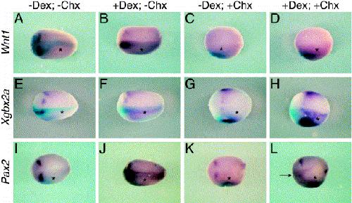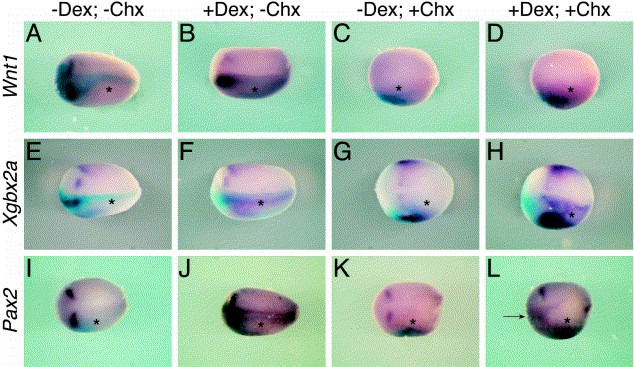 Fig. 4. Otx2 is a direct activator of Wnt1, Xgbx2a and Pax2. RNA encoding the hormone-inducible form of Otx2 was injected unilaterally (the injected side is indicated with an asterisk) together with LacZ mRNA. Cycloheximide was added 30 min prior to the activation of Otx2/GR by dexamethasone to inhibit protein synthesis. The embryos were fixed 2.5 h after the addition of dexamethasone and the expression of Wnt1 (AâD), Xgbx2a (EâH) and Pax2 (IâL) was studied. (A) Expression of Wnt1 in the absence of dexamethasone. (B) Activation of Otx2/GR by dexamethasone resulted in Wnt1 expression along the neural tube. (C) Cycloheximide treatment inhibited the normal endogenous expression of Wnt1. (D) Broad ectopic expression of Wnt1 was observed in embryos incubated with dexamethasone and cycloheximide. The endogenous domains of Wnt1 were inhibited by the cycloheximide treatment. (E) Control Xgbx2a expression in the absence of dexamethasone. (F) Activation of Otx2/GR induced broad ectopic activation of Xgbx2a at the edges of the injected region. (G) Inhibition of protein synthesis causes a general increase in Xgbx2a transcription. (H) Xgbx2a is ectopically activated in embryos incubated with dexamethasone in the presence of cycloheximide. (I) In the absence of activator, Otx2/GR does not affect the normal Pax2 expression. (J) Pax2 is broadly activated in embryos treated with dexamethasone. (K) Inhibition of protein synthesis does not affect the MHB-specific expression of Pax2. (L) In the presence of cycloheximide and dexamethasone Pax2 is activated in the injected side (arrow).