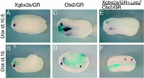 Fig. 5. Time course of the ability of Otx2 and Xgbx2a to affect En2 expression. Embryos were injected unilaterally at the two-cell stage either with Xgbx2a/GR or Otx2/GR RNA, or with both in adjacent cells. The hormone-inducible proteins were activated either at stage 10.5 (A,C,E) or at stage 15 (B,D,F). In all instances LacZ mRNA was co-injected as a lineage tracer. (A) Embryo injected unilaterally with Xgbx2a/GR. Dexamethasone was added at stage 10.5. En2 expression was inhibited on the injected side. (B) Embryo injected similarly to (A), but activation by dexamethasone was at stage 15. The ability of Xgbx2a/GR to inhibit En2 is maintained at stage 15. (C) Embryo injected with Otx2/GR. Dexamethasone was added at stage 10.5. On the injected side, En2 expression was ectopically activated in posterior and lateral regions. (D) Embryo injected similarly to (C), but dexamethasone was added at stage 15. The ability of Otx2/GR to induce ectopic En2 expression was considerably diminished as compared to stage 10.5 activation. The ectopic expression (arrowhead) is restricted to a thin stripe along the midline. (E,F) Embryos injected with Otx2/GR into one cell and Xgbx2a/GR along with the lineage tracer into the adjacent cell. (E) Activation of the proteins at stage 10.5 causes inhibition of En2 expression at the MHB in both the Xgbx2a/GR- and Otx2/GR-injected sides and its posterior ectopic activation in the Otx2/GR-injected side. (F) Dexamethasone addition at stage 15. The MHB expression of En2 is inhibited by both constructs. Weak ectopic activation of En2 is seen along the dorsal midline (arrowheads).