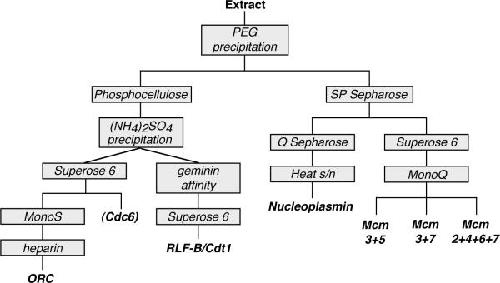 Figure 1. Fractionation scheme for proteins used in this study. Interphase Xenopus egg extract was fractionated by the methods outlined. See Materials and Methods for more details. Cdc6 was not purified to homogeneity but was replaced in the reconstituted reaction with recombinant material produced in insect cells.