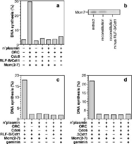 Figure 4. Reconstitution of licensing using purified proteins. a, c, d, Licensing activity of different combinations of purified proteins incubated in the presence of 2.5 mM ATP. DNA synthesis is expressed as % of the DNA template replicated. b, Western blot of Mcm7 loaded onto sperm chromatin in whole Xenopus extract, the full reconstituted reaction and the reconstituted reaction lacking RLF-B/Cdt1. The reconstituted reactions contained 2.5 mM ATP.