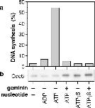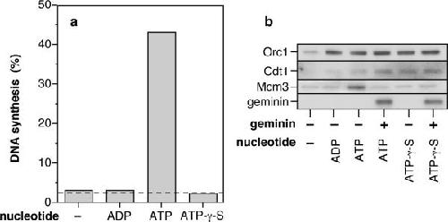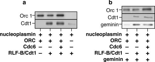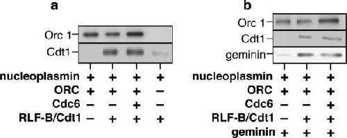 Figure 5. Requirements for Cdt1 and geminin association with chromatin. a, b,Xenopus sperm nuclei were incubated with the indicated proteins in the presence of 2.5 mM ATP. Chromatin was then isolated and immunoblotted for the presence of bound Orc1, Cdt1 and geminin. The RLF-B/Cdt1 was a slightly more active fraction taken from the geminin bead eluate.