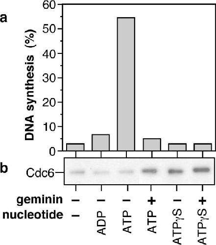 Figure 7. Nucleotide requirement for Cdc6 chromatin association in desalted extracts. Sperm nuclei were incubated in desalted whole egg extract plus or minus geminin in the presence of either ADP, ATP, ATP-γ-S at 2.5 mM, or no added nucleotide. a, The degree of functional licensing was assessed, expressed as % of the DNA template replicated. b, Chromatin was isolated and immunoblotted for the presence of Cdc6.