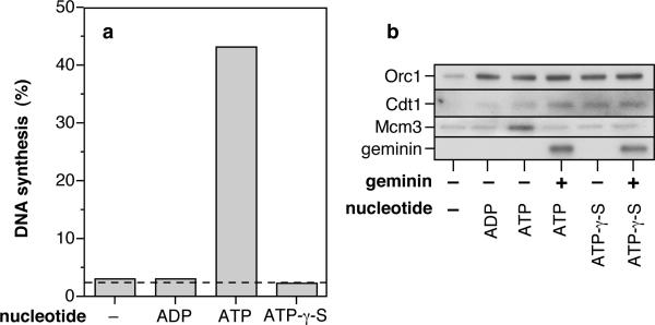 Figure 6. Nucleotide requirements of the reconstituted reaction. Xenopus sperm nuclei were incubated with nucleoplasmin, ORC, Cdc6, RLF-B/Cdt1, Mcm2-7 plus or minus geminin in the presence of either ADP, ATP, ATP-γ-S at 2.5 mM, or no added nucleotide. a, The degree of functional licensing was assessed, expressed as % of the DNA template replicated. b, Chromatin was isolated and immunoblotted for the presence of Orc1, Cdt1, Mcm3 and geminin. The Mcm2-7 was a slightly more active fraction taken from the gel filtration step in the purification, and the RLF-B/Cdt1 was from the geminin bead eluate.