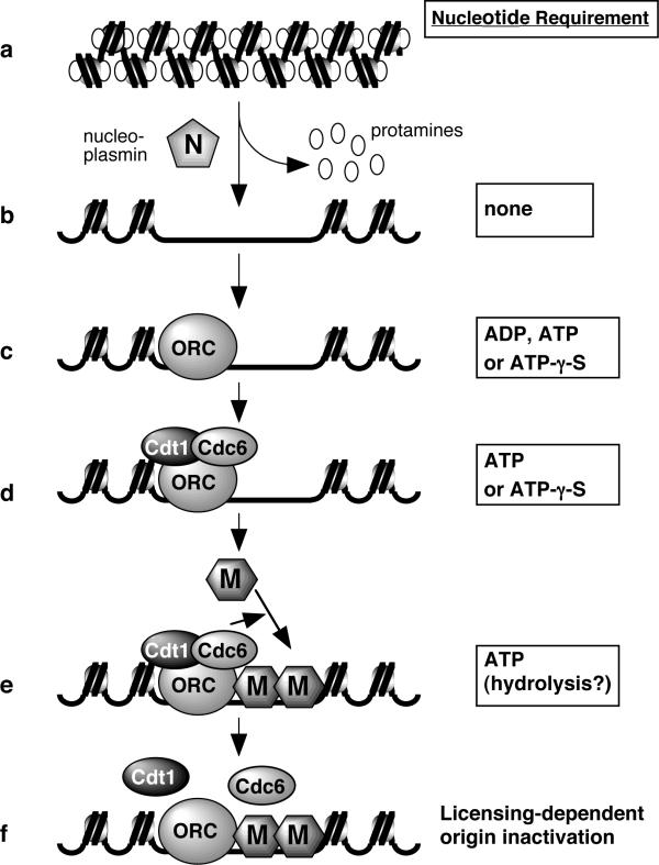 Figure 8. Stages in the assembly of licensed replication origins on sperm nuclei. A cartoon of a small segment of Xenopus sperm DNA is shown following exposure to egg cytoplasm. Nucleotide requirements are shown on the right. a, Condensed sperm chromatin, with H2A and H2B replaced by protamines. b, Removal of protamines by nucleoplasmin. c, Assembly of ORC onto origins, requiring ADP, ATP or ATP-γ-S. d, Assembly of Cdc6 and RLF-B/Cdt1 onto ORC-containing DNA, requiring ATP or ATP-γ-S. e, The loading of Mcm2-7 hetero-hexamers onto chromatin represents origin licensing. 10–20 copies of Mcm2-7 can be assembled onto each origin. This step requires hydrolysable ATP. f, Once licensing is complete, the affinity of Cdc6 and RLF-B/Cdt1 for origins is decreased (licensing-dependent origin inactivation).
