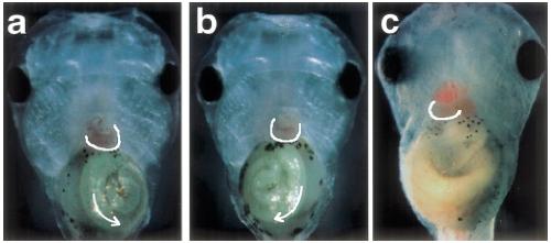Fig. 4. Xenopus embryos exhibiting situs solitus and abnormal situs. Embryos are shown in the ventral view. (a) An embryo with