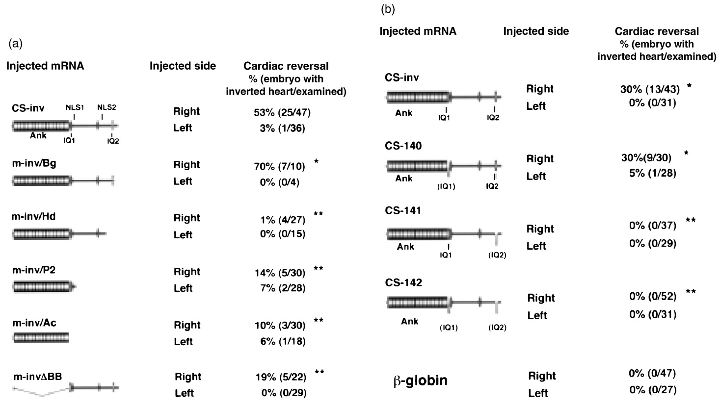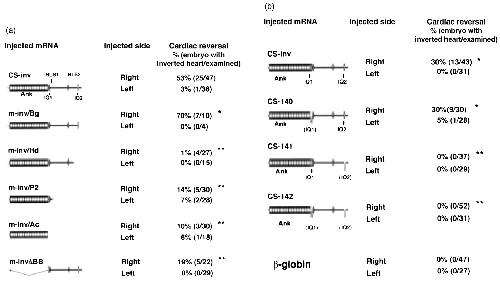 Fig. 7. (a) Cardiac reversal in embryos injected with full-length inv, C-terminus-truncated inv and the ankyrin repeat-deleted inv mRNA.