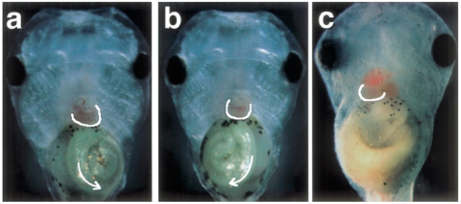 normal cardiac looping and gut coiling. (b) An embryo with inverted heart and gut coiling (situs inversus). (c) An example of disturbed