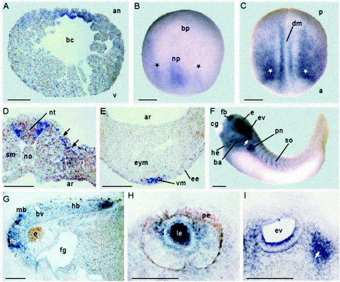 Fig. 2. Whole-mount in situ hybridization analysis of Xsap-1 expression during early Xenopus embryogenesis. Staged Xenopus embryos were subjected to whole-mount in situ hybridization with Xsap-1 antisense RNA. (A) Transverse section of a blastulaembryo (stage NF8) showing expression in the animal cap. (B) Dorsal view of a late gastrulaembryo (stage NF12.5). Xsap-1 is expressed weakly in the notoplate (np) and adjacent regions (stars). (C) Dorsal view of a neurulaembryo (stage NF20). Signals are detected in two stripes flanking the dorsal midline (dm) and in the lateral regions of the embryo (stars). (D) Central transversal section of a neurulaembryo (stage NF20) with dorsal expression of Xsap-1 in cells of the forming neural tube (nt) and in the sensorial layer of the epidermal ectoderm (arrows). (E) Ventral part of the same section as shown in D. Xsap-1 is expressed in the ventralmesoderm (vm). (F) Lateral view of a tadpoleembryo (stage NF36) showing signals in different regions of the head, pronephros and in the somites. (G) Anterior parasagittal section of a tadpoleembryo (stage NF36) showing expression in all brain areas (fb, mb, hb; anterior is to the left). (H, I) Details from an anterior parasagittal section of a tadpoleembryo (stage NF36). Xsap-1 is expressed in the lens (le), the ear vesicle (ev), and in a region posterior to the ear (arrow in I; in both figures dorsal is oriented to the top). In all figures the bar represents 300 μm. Embryo staging was according to Nieuwkoop and Faber (1967). Abbreviations: a, anterior; an, animal pole; ar, archenteron; ba, branchial arches; bc, blastocoel; bp, blastoporus; bv, brainventricle; cg, cement gland; dm, dorsal midline; e, eye; ee, epithelial and sensorial layer of epidermal ectoderm; ev, ear vesicle; eym, endodermal yolk mass; fb, forebrain; fg, foregut; hb, hindbrain; he, heart; le, lens; mb, midbrain; no, notochord; np, notoplate; nt, neural tube; p, posterior; pe, pigment epithelium; pn, pronephros; sm, somitic mesoderm; so, somites; v, vegetal pole; vm, ventralmesoderm.
