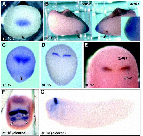 Fig. 3. Whole-mount in situ hybridization analysis of XHR1 expression during early development. (A) Dorsal view of a stage 10.5 embryo. The animal side is to the top. XHR1 expression is detected in a narrow area of the dorsal side. (B) Comparison of the expression domains of Sox-2 and XHR1. A stage 10.5 embryo was bisected sagittally into two hemispheres and was then hybridized with Sox-2 (left panel) or XHR1 (right panel). The animal side is to the top. The inset shows the higher magnification view of XHR1 expression in the sensorial layer. (C) Dorsal view of a stage 12 embryo. Anterior is to the top. The expression domain is sharpened and reduced in the midline, giving a V-shaped form. (D) Dorsal view of a stage 15 embryo. Anterior is to the top. XHR1 expression is confined to a limited area in the anteriorneuroectoderm. (E) Dorsal view of a stage 17 embryo stained with XHR1 (brown) and En-2 (purple). Anterior is to the top. The expression of both XHR1 and En-2 overlaps. (F) Dorsoanterior view of a cleared stage 18 embryo. XHR1 is expressed in the prospective eye region (white arrowhead) and possible pineal gland region (white arrow) too. (G) Lateral view of a cleared stage 28 embryo. Anterior is to the left. XHR1 expression is restricted in the MHB region with slight expression in forebrain.
