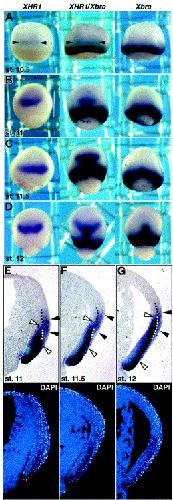 Fig. 5. XHR1 expression in the prospective MHB region at gastrula stages. Expression of XHR1 was compared with that of Xbra during gastrula stages by whole-mount in situ hybridization and sections. (AâD) Gastrula embryos hybridized for XHR1 (left panel), for Xbra (right panel), and for both (middle panels). All embryos are dorsally viewed, and animal or anterior is to the top. (EâG) Sagittal sections of embryos hybridized for both XHR1 and Xbra. Only dorsal halves are shown, and animal is to the top. The boundary between the ectoderm and mesoderm is indicated by dotted lines, and was determined based on the differences in nuclear density of germ layers visualized by DAPI staining (lower panels). Arrowheads, delimitation of XHR1 expression; white arrowheads, delimitation of Xbra expression; st., developmental stage.