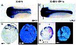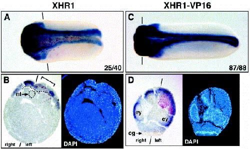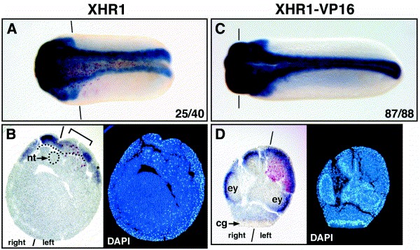Fig. 8. nrp-1 expression in XHR1 or XHR1-VP16 RNA-injected embryos. Injected embryos at the tailbud stage (stages 24/25) were stained with nβ-gal (red) and then hybridized for nrp-1 (purple). RNA, 100 pg, for wild-type XHR1 (A, B) or 50 pg of RNA for XHR1-VP16 (C, D) were injected. (B, D) Sections of stained embryos. Right panel, staining with DAPI. Sections are at the levels indicated by solid bars in (A, C). Solid bar (B, D), midline; broken line, the boundary between neural and mesodermal tissues; bracket, an area lacking nrp-1 expression in the neural tissue; nt, notochord; ey, eye; cg, cement gland.