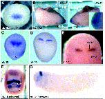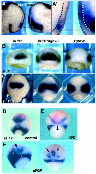 Fig. 6. (AâC) Comparison of expression of XHR1 with that of Xotx2 and Xgbx-2 at gastrula stages. (A) A stage 11 embryo was bisected sagittally into two hemispheres and was then hybridized for XHR1 (left panel) or Xotx2 (right panel). Animal is to the top. (Aâ²) Higher magnification of (A). The expression domain of XHR1 does not correspond to that of Xotx2 in the ectoderm. (B, C) Embryos at stages 11 or 11.5 hybridized for XHR1 (left panel), for Xgbx-2 (right panel), and for both (middle panel). All embryos are dorsally viewed, and animal is to the top. (DâF) Possible regulation of XHR1 expression by the Xbra-expressing region. Embryos were injected with mRNA or DNA as indicated together with nβ-gal mRNA (30 pg/embryo) for a lineage tracer. Double in situ hybridization with XHR1 and Xbra probes was performed after nβ-gal staining. (D) Injection of globin mRNA as negative control. (E) Injection of XFD mRNA (60 pg/embryo). Xbra expression was reduced in a nβ-gal-stained region as indicated by an arrowhead. (F) Injection of CSKA-eFGF (10 pg/embryo). In situ staining in nβ-gal-positive region means Xbra expression as indicated by asterisks. Two typical phenotypes are shown. Dotted lines, the boundary between ectoderm and mesoderm that was determined based on the differences in nuclear density of germ layers visualized by DAPI staining (data not shown; see Fig. 5EâG); st., developmental stage; thick arrows, shifted XHR1 expression; thin arrows, XHR1 expression; white asterisks, Xbra expression.