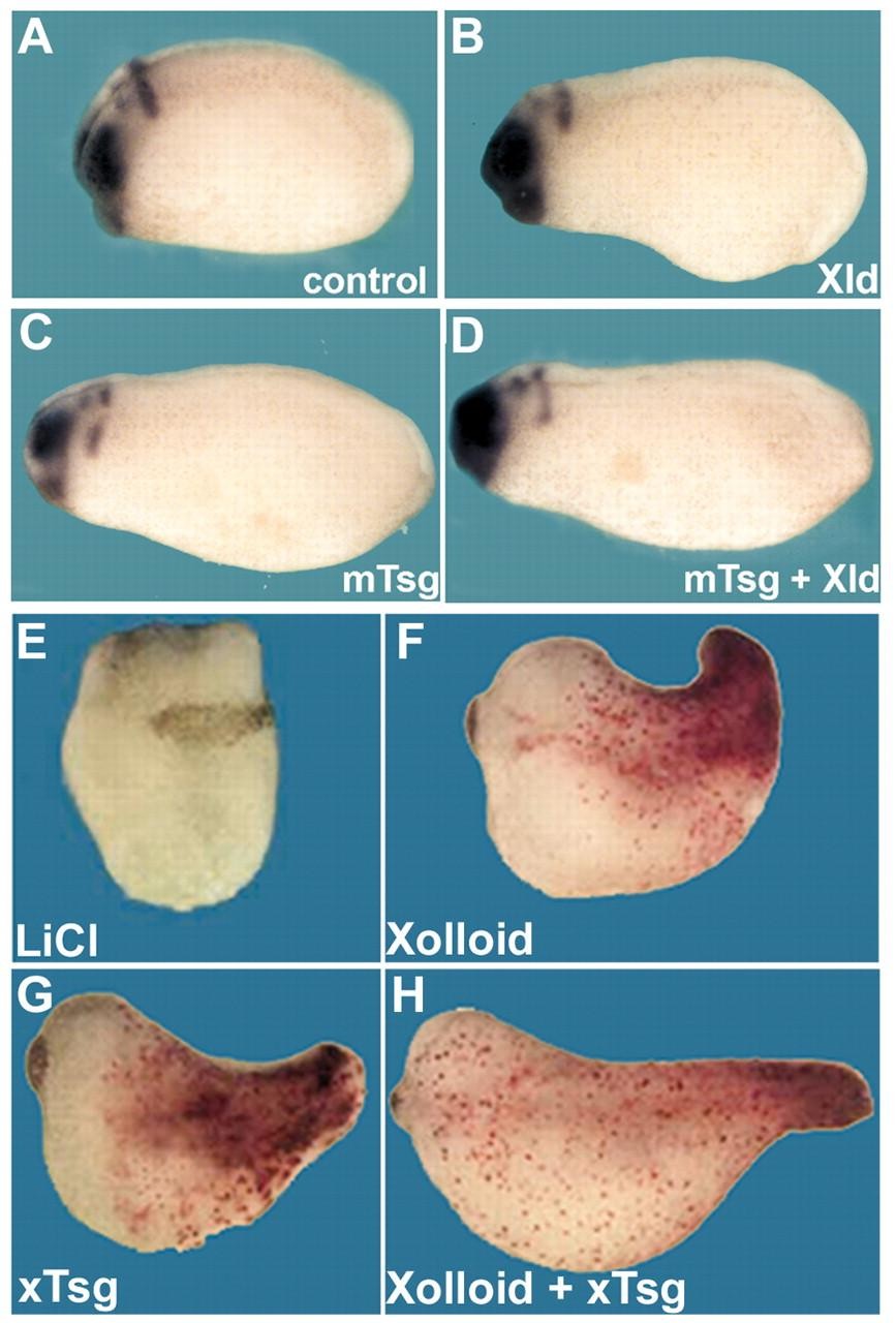 Fig. 1. Tsg and Xolloid ventralize the Xenopus embryo. (A) Uninjected stage 18 control embryos stained for krox20 and otx2. (B) Embryos microinjected at the four-cell stage four times at the animal pole with 100 pg Xolloid, (C) 250 pg mouse Tsg or (D) both mRNAs. Same results were obtained using Xenopus Tsg mRNA (data not shown). For each mRNA combination at least 25 embryos were analyzed. (E-H) LiCl-treated embryos. (E) Radially dorsalized LiCl-treated embryo (n=40; dorsoanterior index, DAI=9.5); (F) embryo microinjected into a single blastomere of the marginal zone at the 16-cell stage with 200 pg Xolloid (26% with trunk/tail structures, n=23, DAI=8); (G) 500 pg Xenopus Tsg (32%, n=33, DAI=8.1); or (H) both mRNAs (51%, n=27, DAI=7). Lineage tracing with lacZ and Red-Gal shows that the cells injected with Xenopus Tsg or Xolloid mRNA contributed mostly to ventroposterior mesoderm in the rescued tail region.