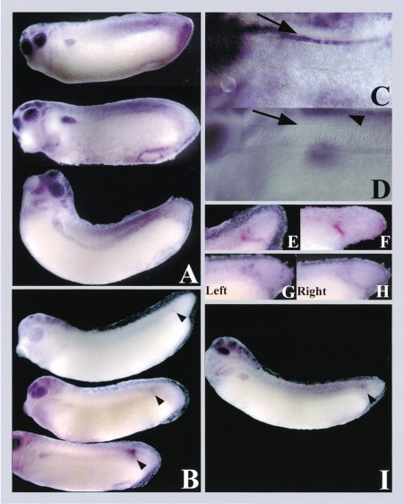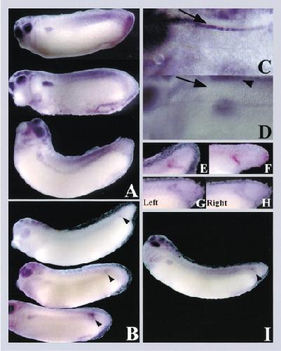 Figure 3. Reconstitution of the hairy2a Pattern in Transgenic Xenopus Embryos(A) Whole-mount in situ hybridization for eGFP using the H2pm transgene.(B) H2pmH2G transgenes express eGFP in the PSM stripe (arrowheads).(C) The arrow indicates hairy2a expression in the floorplate.(D) The arrow indicates no transgene expression in the floorplate, while the arrowhead indicates expression in the roofplate.(E and F) H2pmH2G transgenes mimic the variability of the hairy2a PSM stripe.(G and H) The H2mpH2G transgene mimics the left-right asymmetry of hairy2a. The left side image has been flipped to be in the same orientation as the right side.(I) H2pm3U transgene expresses eGFP in the anterior PSM stripe (arrowhead)