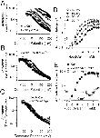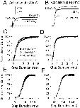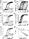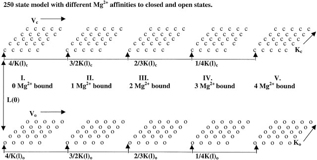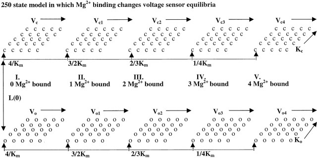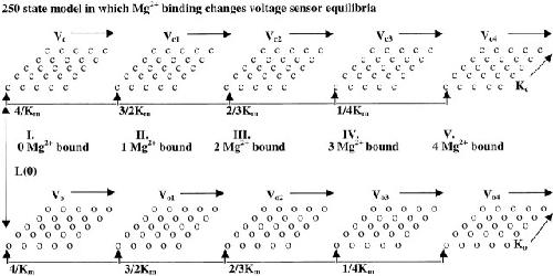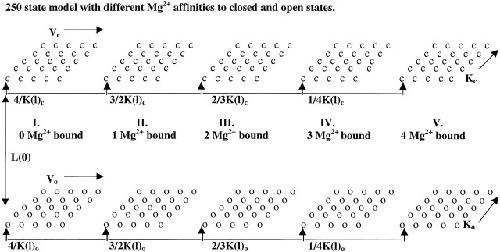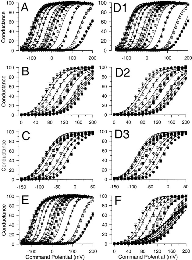 Figure 14. The dependence of Slo1 conductance on Ca2+, Mg2+ and voltage can be described by a 250 state allosteric model involving the independent action of Ca2+, Mg2+ and voltage-sensor movement. In A, G-V curves obtained at different [Ca2+] given in Fig. 2 D (data set 1) were fit with with the solid lines resulting from the values given in column A, Table . L(0) was constrained to 500000. In B, G-V curves obtained with 0 Ca2+ (•) plus 0.5 (○), 1 (♦), 2 (⋄), 5 (▪), 10 (□), 20 (▴), 50 (▵), and 100 (5) mM Mg2+ (data set 2) were also fit with , with parameters given in Table , column B. In C, G-V curves obtained with 300 μM Ca2+ with [Mg2+] from 0 to 100 mM (data set 3; symbols are as in B, but with no 0.5-μM points) were fit with . The solid lines correspond to the fit resulting from the values given in column C, Table . Comparison of the values in columns A, B, and C indicate that quite similar values yield a good general description of G-V curves over all [Ca2+], all [Mg2+], and all voltages, except that the multiple Mg2+ binding affinities defined by are not well-described in the fit to data set 3. In D1–D3, G-V curves shown in A-C were simultaneously fit with , yielding the values given in Table (column D). Again, the general features of the shift in curves as a function of Ca2+ and Mg2+ is reasonably well-described. In E, G-V curves obtained over all [Ca2+] were fit with , which assumes that Mg2+ influences the voltage-sensor equilibrium. Fitted curves correspond to values given in Table (column A). In F, G-V curves at 0 Ca2+ were also fit with . When values obtained from fitting G-V curves at higher Ca2+ were used, it was not possible to obtain estimates for Km and E that resulted in adequate descriptions of the data. The curves with open circles were generated from values in column C, Table . L(0) was set to a value in which currents in 0 Ca2+ were well-described. However, the G-V curves at 10 and 50 mM Mg2+ could not be captured. However, when more parameters were left unconstrained, could yield a fit that captured the G-V curves in 0 Ca2+ (smaller closed circles), but these values (column D, Table ) totally failed to describe the behavior of G-V curves at higher Ca2+.