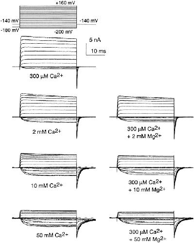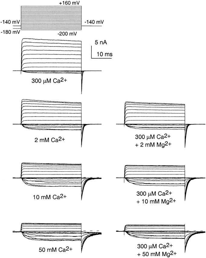 Figure 1. Similar enhancement of Slo1 current activation by high concentrations of either Ca2+ and Mg2+. Each family of traces shows currents from the same inside-out patch from a Xenopus oocyte, expressing mSlo1 α subunits. Currents were activated by the voltage protocol shown on the top left with the indicated divalent cation concentrations applied to the cytosolic face of the patch. On the left, traces were obtained with 300 μM Ca2+, 2 mM Ca2+, 10 mM Ca2+ and 50 mM Ca2+ from top to bottom. On the right, each family of traces was obtained with 300 μM Ca2+ but with added 2, 10, and 50 mM Mg2+ from top to bottom. Tail currents were recorded at −140 mV. For solutions containing 10 and 50 mM divalent, the potential before the activation steps (−200 to +160 mV) was −180 mV, and −140 in other cases. Note the strong slowing of deactivation with either Ca2+ and Mg2+, the similar activation of current with additions of mM Ca2+ or Mg2+, and the strong block of current at positive activation potential at higher divalent concentrations.