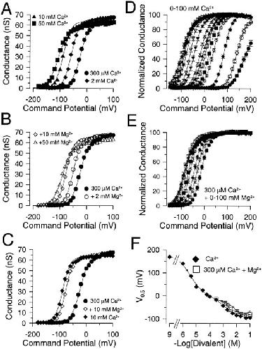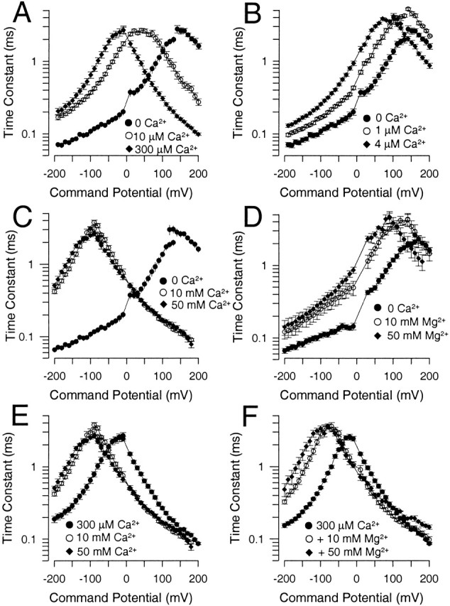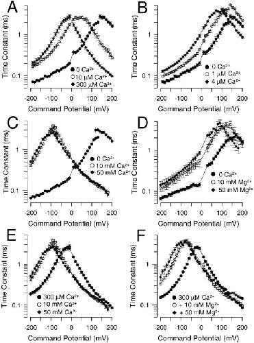 Figure 11. Comparison of effects of Ca2+ and Mg2+ on primary time constant of Slo1 current relaxations. In A, activation and deactivation time constants obtained at 0, 10, and 300 μM Ca2+ are plotted as a function of potential. In B, the shift in relaxation time constant with 1 and 4 μM are compared with 0 μM Ca2+. Note the unusual slowing of activation with 1 μM Ca2+. In C, the effects of 10 and 50 mM Ca2+ are compared with 0 Ca2+, whereas, in D, the effects of 10 and 50 mM Mg2+ are compared with 0 Ca2+. In E, the effects of 10 and 50 mM Ca2+ are compared with 300 μM Ca2+, whereas, in F, the effects of 10 and 50 mM Mg2+ plus 300 μM Ca2+ are compared with 300 μM Ca2+.