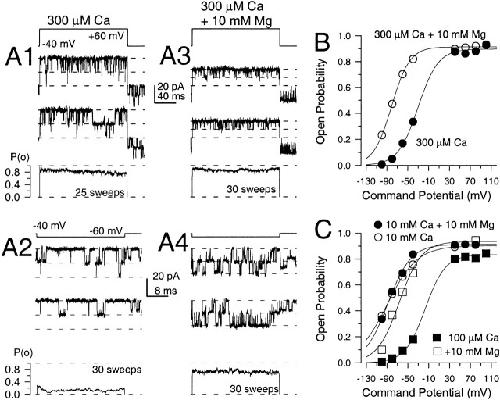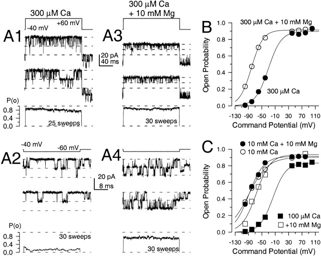 Figure 3. Millimolar Mg2+ and Ca2+ produce similar shifts to more negative potentials in the relationship between open probability and voltage. In A, traces show currents from an inside-out patch containing two BK channels. Patches were held at −40 mV with repeated voltage steps to either +60 mV (A1 and A3), or −60 mV (A2 and A4). On the left (A1 and A2), channels were activated with 300 μM Ca2+, whereas on the right (A3 and A4) channels were activated with 300 μM Ca2+ plus 10 mM Mg2+. In each panel, the ensemble average expressed in units of probability of being open (Po) is plotted at the bottom. At +60 mV, the addition of Mg2+ has little effect on Po, but reduces the single-channel current amplitude. At −60 mV, Mg2+ produces a substantial increase in Po, with only a mild reduction in the single-channel amplitude. In B, Po estimates obtained from the ensemble averages are plotted as a function of command potential for the patch shown in A. Solid lines are fits of . At 300 μM Ca2+, fitted values with 90% confidence limits were gmax = 0.89 ± 0.02, V0.5 = −30.7 ± 5.1 mV, and k = 19.2 ± 4.4 mV; for 300 μM Ca2+ plus 10 mM Mg2+, gmax = 0.91 ± 0.01, V0.5 = −81.0 ± 1.0 mV, and k = 17.9 ± 1.0 mV. In C, Po versus voltage is plotted for a different patch showing that activation by 10 mM Ca2+ is similar to that produced by 10 mM Ca2+ plus 10 mM Mg2+. Fitted values were as follows: for 100 μM Ca2+, gmax = 0.83 ± 0.02, V0.5 = −16.5 ± 4.9 mV, and k = 19.4 ± 2.7 mV; for 100 μM Ca2+ plus 10 mM Mg2+, gmax = 0.94 ± 0.11, V0.5 = −66.2 ± 8.9 mV, and k = 21.3 ± 8.5 mV; for 10 mM Ca2+, gmax = 0.91 ± 0.06, V0.5 = −89.2 ± 5.4 mV, and k = 25 ± 6.9 mV; and for 10 mM Ca2+ plus 10 mM Mg2+, gmax = 0.92 ± 0.04, V0.5 = −87.7 ± 3.2 mV, and k = 22.6 ± 3.8 mV.