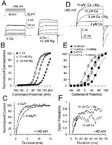 Figure 4. Mg2+ also shifts current activation in lower Ca2+ or 0 Ca2+. In A, currents on the left were activated by the indicated protocol with a solution containing trace Ca2+ with 10 mM EGTA. On the right, currents were activated from the same patch with a solution containing 0 Ca2+, 5 mM EGTA but with 10 mM Mg2+. In 0 Ca2+, time constants of activation (τa) were 1.85, 1.50, 1.12 ms for +120, +140, and +160 mV, respectively. With 10 mM Mg2+, τa was 4.0, 2.72, and 2.22 ms at +120, +140, and +160 mV, respectively. In B, the normalized conductance is plotted as a function of command potential for 0 Ca2+ (eight patches), 10 mM Mg2+ (eight patches) and 50 mM Mg2+ (seven patches). Conductance values were normalized in each patch to the maximum value obtained with 50 mM Mg2+. Fits of (solid lines) yielded values for V0.5 of 170.7 ± 2.6 mV (k = 23.6 mV) for 0 μM Ca2+, 110.5 ± 0.6 mV (k = 18.3 mV) for 10 mM Mg2+, and 78.0 ± 0.5 mV (k = 18.3 mV) for 50 mM Mg2+. In C, currents activated at +140 mV were normalized to peak steady-state amplitude of a single exponential fit to the rising phase of currents activated either with 0 Ca2+ or with 0 Ca2+ + 10 mM Mg2+. The time constant of activation with 0 Ca2+ was 1.50 ms, whereas with 10 mM Mg2+ was 2.72 ms. The slowing of activation with Mg2+ was consistently observed at all activation voltages and argues that the additional activation by Mg2+ is not the result of an increase in trace Ca2+. In D, currents were activated by a voltage step to +80 mV with either 4 or 10 μM Ca2+ without or with the addition of 10 mM Mg2+. Unbuffered divalent cation solutions were prepared as described in the materials and methods. Note the increased current amplitude and slower activation of current in the presence of Mg2+. In E, G-V curves were constructed from measurement of tail currents from a set of 4 patches studied as in D. Error bars represent the SEM of four patches. The V0.5 for each curve is 37.6 ± 1.8 mV (10 μM Ca2+), 11.6 ± 2.5 (10 μM Ca2+ + 10 mM Mg2+), 73.8 ± 1.1 mV (4 μM Ca2+), and 47.8 ± 1.1 mV (4 μM Ca2+ plus 10 mM Mg2+). Buffered Ca2+ solutions prepared at the same time and tested on the same patches yielded V0.5 values of 36.2 ± 1.6 mV for 10 μM Ca2+ and 71.2 ± 1.2 mV for 4 μM Ca2+. In F, ensemble averaged currents were generated from channels activated with the indicated solutions for a voltage-step to +40 mV from a patch containing two channels. The addition of Mg2+ increases the open probability towards maximal values but slows down the time constant of current activation. With 10 μM Ca2+, the activation time constant was 1.4 ± 0.3 ms, whereas with 10 μM Ca2+ plus 10 mM Mg2+ the time constant was 11.1 ± 0.5 ms.