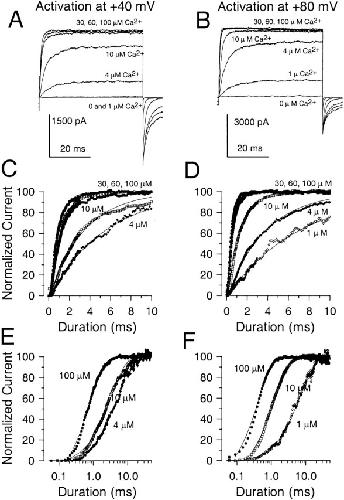 Figure 6. The current activation rate increases substantially as Ca2+ is raised from 1 μM to 100 μM. In A, currents were activated by a voltage step to +40 mV with Ca2+ concentrations of 0, 1, 4, 10, 30, 60, and 100 μM as indicated. In B, currents were activated in the same patch by a voltage-step to +80 mV with the same Ca2+ concentrations. In C, currents activated by the step to +40 mV were normalized to their maximal amplitude and fit with single exponentials. The activation time constants (τa) were 5.45, 3.38, 1.21, 1.05, and 0.80 ms, for 4, 10, 30, 60, and 100 μM, respectively. In D, the normalized current activation time course for the voltage-steps to +80 mV are shown. τa's were 7.08, 3.77, 1.23, 0.53, 0.46, and 0.39, for 1, 4, 10, 30, 60, and 100 μM Ca2+, respectively. In E and F, the same normalized traces shown in C and D are plotted on a logarithmic time base to show the shift in activation time course with Ca2+. An increase in Ca2+ from 1 to 10 μM produces a similar three to fourfold change in activation rate as the increase from 10 to 100 μM. At +40 mV, the trace in response to 4 μM Ca2+ is plotted since at 1 μM there is almost no detectable current activation.