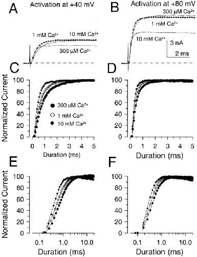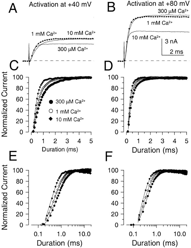 Figure 7. Increases of Ca2+ from 300 μM to 10 mM produce smaller increases in current activation time rate. In A and B, currents were activated by 300 μM, 1 mM, and 10 mM Ca2+ at either +40 mV (panel A) or +80 mV (panel B). In C and D, each trace in A and B was normalized to the maximal current amplitude to compare the activation time course. Points show every fourth digitized current value. Solid lines are the best fit of a single exponential function to the activation time course. At +40 mV, the activation time constant (τa) was 0.73, 0.52, and 0.33 ms for 300 μM, 1 mM, and 10 mM Ca2+, respectively. At +80 mV, τa was 0.38, 0.28, and 0.19 ms for 300 μM, 1 mM, and 10 mM Ca2+, respectively. In E and F, the normalized current activation time course is plotted on a logarithmic time base to allow better comparison of the relatively small concentration dependence of the activation rate for this 30-fold change in concentration compared with that shown in Fig. 6.
