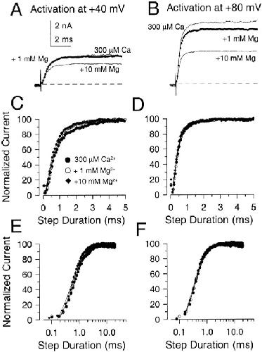 Figure 8. Addition of Mg2+ concentrations which markedly shift G-V curves does not increase the limiting rate of Slo1 current activation. In A and B, traces were elicited in each panel with 300 μM Ca2+ alone, and with 300 μM Ca2+ with either 1 mM or 10 mM Mg2+. Traces on the left were activated by a voltage step to +40 mV and, on the right, to +80 mV. In C and D, the normalized current activation time course is plotted on a linear time base (every fourth digitized value is plotted), while, in E and F, the same traces are shown on a logarithmic time base. Solid lines are fits of a single exponential function to the activation time course. At +40 mV, τa was 0.75, 0.64, and 0.59 ms for 300 μM Ca2+, 300 μM Ca2+ + 1 mM Mg2+, and 300 μM Ca2+ + 10 mM Mg2+, respectively. At +80 mV, τa was 0.38, 0.36, and 0.33 ms for each solution. Raising Mg2+ up to 10 mM results in little effect on the time course of current activated in the presence of 300 μM Ca2+.