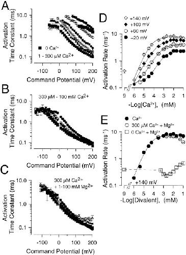Figure 9. Millimolar concentrations of either Ca2+ or Mg2+ are similar in their effects on current activation rates. In A, the time constant of activation (τa) is plotted as a function of command potential for Ca2+ concentrations of 1 μM (•), 4 μM (○), 10 μM (♦), 30 μM (⋄), 60 μM (▴), 100 μM (▵), and 300 μM (▪). Error bars in A and B are SEM for 4-13 patches. In B, τa is plotted as a function of command potential for Ca2+ concentrations of 300 μM (•), 1 mM (○), 2 mM (♦), 5 mM (⋄), 10 mM (▪), 20 mM (□), 50 mM (▴), and 100 mM (▵). In C, τa is plotted as a function of command potential for solutions containing 300 μM with added Mg2+ of 0 mM (•), 1 mM (○), 2 mM (♦), 5 mM (⋄), 10 mM (▪), 20 mM (□), 50 mM (▴), and 100 mM (▵). Each point shows the mean and SEM of 4-11 patches. In D, the mean rate of current activation for Slo1 currents is plotted as a function of Ca2+ for command potentials of +20 (•), +60 (○), +100 (♦), and +140 (⋄) mV. Error bars are SEM. Solid lines are fits of . At +20 mV, kmax was 2.4, Kd = 0.87 ± 0.30 μM, and n = 0.88 ± 0.28. At +60 mV, kmax was 4.1, Kd = 398 ± 160 μM, and n = 0.77 ± 0.20; at +100 mV, kmax = 6.0, Kd = 181 ± 59 μM, and n = 0.72 ± 0.14; at +140 mV, kmax = 7.7, Kd = 59 ± 25 μM, and n = 0.92 ± 0.32. Note the anomalous slowing of current activation rate at 1 μM Ca2+ relative to 0 μM at +140 mV. This point was not included in the fit. In E, current activation rate is plotted as a function of total divalent in the solution at +140 mV for solutions with no added Mg2+ (•) and solutions with Mg2+ added to 300 μM Ca2+ (○), showing that Mg2+ has little effect on the limiting rate of current activation, although additional depolarization will produce an increase in current activation rate. Note the inhibition of activation rate at the highest [Mg2+]. Current activation with 0 Ca2+ and various [Mg2+] is also plotted (□), showing the relative lack of effect of Mg2+ in comparison to Ca2+.