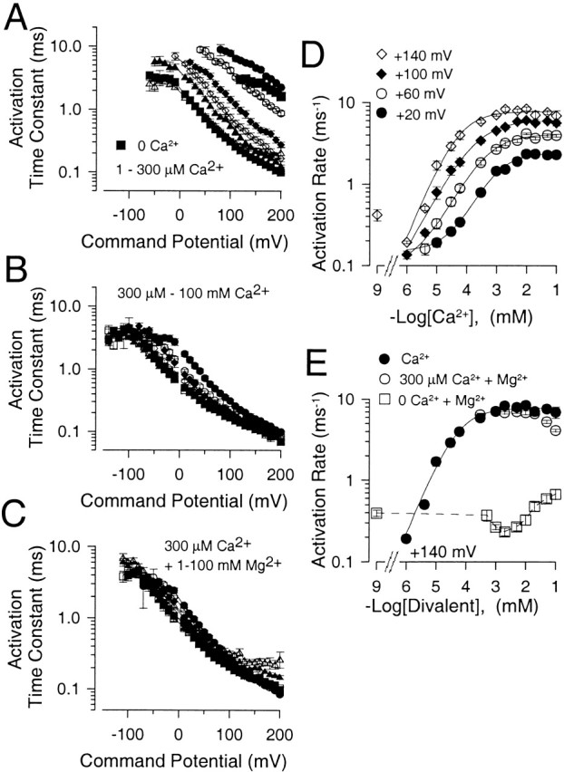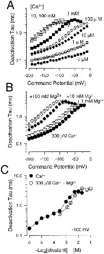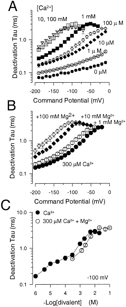 Figure 10. Millimolar concentrations of Mg2+ and Ca2+ have similar effects on current deactivation. In A, the deactivation time constants are plotted as a function of command potential for [Ca2+] spanning over six orders of magnitude, 1 μM–100 mM. Points and error bars are means and SEM of 5–15 patches. In B, the deactivation time constants are plotted as a function of command potential for tail currents obtained with 300 μM Ca2+ and 300 μM Ca2+ plus 1, 10, and 100 mM added Mg2+. Points show means and SEM for 4–8 patches. In C, the deactivation time constant measured at −100 mV is plotted as a function of total [divalent] for solutions with only Ca2+ (•) and for solutions with 300 μM Ca2+ with added Mg2+ (○). The slowing of deactivation with either elevated Ca2+ or Mg2+ exhibits saturation, although at somewhat different concentrations.