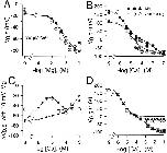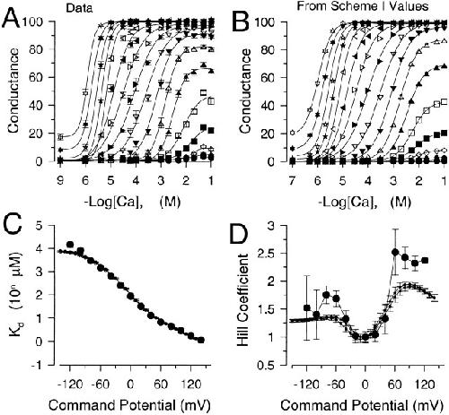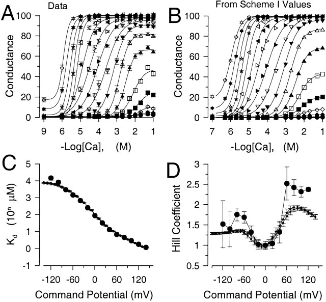 Figure 12. The behavior of Kd and Hill coefficient over all [Ca2+]. In A, conductances given in Fig. 2 D were replotted to show the Ca2+ dependence of conductance at a given voltage. Each point is the mean and SEM for the estimate. Solid lines are fits of the modified Hill equation given in the text. Symbols correspond to potentials of −200 (•), −180 (○), −160 (♦), −140 (⋄), −120 (▪), −100 (□), −80 (▴), −60 (▵), −40 (▾), −20 (▿), 0 (▸), +20 (▹), +40 (◂), +60 (◃), +80 (★), +100 (⋆), +120 (closed six-pointed star), and +140 (open six-pointed star) mV. In B, conductance values predicted from Fig. 1 (see Fig. 14) based on values given in Table (column D) were plotted as a function of [Ca2+] and fit with the modified Hill equation (solid lines). Symbols are as in A. In C, estimated values for the Kd for apparent Ca2+ affinity (•) obtained from fitting the data in Fig. 12 A are plotted as a function of command potential. The solid line with small filled circles corresponds to values for Kd predicted from Fig. 1 as shown in Fig. 12B. The line with small open circles corresponds to Kd values assuming no Mg2+ inhibition of the high affinity site. In D, the Hill coefficients determined from Fig. 12 A (•) are plotted as a function of voltage. Error bars represent the 90% confidence limit on the estimate of the Hill coefficient. The dotted lines show the predictions from Fig. 1 as determined from values in Table , column D (Fig. 12 B, small closed circles) or from Table , column F (small open circles, no Mg2+ inhibition).