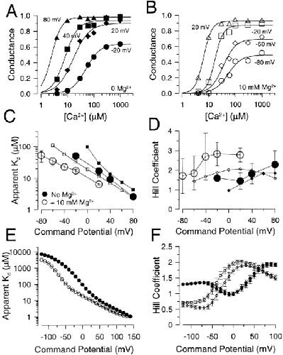 Figure 13. The apparent Hill coefficient for activation of conductance by Ca2+ is increased by Mg2+. In A, each point is the estimate of conductance activated at a given Ca2+ and voltage obtained from normalized G-V curves. Solid lines are fits of the modified Hill equation given in the text. Fitted values for apparent Kd and Hill coefficient are plotted in C and D, respectively. Values used in this figure were from a different set of patches than shown in Fig. 2 or Fig. 12. In B, conductance estimates obtained in the presence of 10 mM Mg2+ are plotted as a function of Ca2+ for a range of voltages. At comparable voltages, the Hill coefficient for activation is higher in the presence of Mg2+. In C, the apparent Kd (in μM) for activation of conductance by Ca2+ either in the absence (•) or presence (○) of 10 mM Mg2+ is plotted as a function of activation potential. The apparent Ca2+ affinity is increased at a given potential in the presence of Mg2+. The error bars are 90% confidence limits from the estimates of K0.5 obtained in A and B. Predictions from Fig. 1 (Table , column D) for solutions without Mg2+ (▪) or with Mg2+ (□) are also shown. In D, the Hill coefficient and confidence limits for the activation of conductance by Ca2+ either in the absence (•) or presence (○) of Mg2+ are plotted as a function of command potential, along with estimates (no Mg2+ [♦], +10 mM Mg2+ [⋄]) from Fig. 1 based on estimates of Mg2+ affinities from column B of Table . Both for experimental data and the theoretical predictions, there is a trend for increased Hill coefficient at more positive potentials and, at any given potential, Mg2+ increases the apparent Hill coefficient. In E, the Kd for Ca2+ effect predicted from Fig. 1 is plotted over a wider range of potentials. Both with (○) and without (•) 10 mM Mg2+, at the most negative potentials a limit in the Kd is observed, while affinity increases dramatically with depolarization. In F, the behavior of Hill coefficient as a function of command potential predicted by Fig. 1 is displayed over a wider range of potentials. Predictions from Fig. 1 assuming Mg2+ inhibition of the high affinity site (Table , column D) are shown both without (•) and with (○) 10 mM Mg2+. Predictions from Fig. 1 with no Mg2+ inhibition (Table , column F) are also shown without (♦) and with (⋄) 10 mM Mg2+.