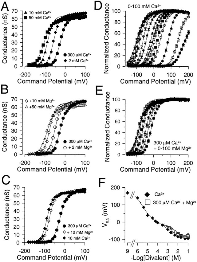 Figure 2. High concentrations of Ca2+ and Mg2+ are similarly effective at shifting current activation. In A, G-V curves were generated from tail currents obtained with 300 μM, 2 mM, 10 mM and 50 mM Ca2+ (patch in Fig. 1). Solid lines are fits of , with values for V0.5 of −21.5 ± 1.0 mV (k = 17.1 mV), −57.1 ± 0.7 mV (k = 14.6 mV), −87.5 ± 0.7 mV (k = 14.4 mV) and −104.5 ± 1.1 mV (k = 19.0 mV), for 300 μM–50 mM Ca2+, respectively. In B, G-V curves from the same patch as in A are shown for currents obtained with 300 μM Ca2+, and 300 μM Ca2+ with either 2, 10, or 50 mM added Mg2+. Values for V0.5 for 2, 10, and 50 mM Mg2+ containing solutions were as follows:−48.7 ± 1.0 mV (k = 14.8 mV), −75.5 ± 0.8 mV (k = 14.5 mV), and −87.4 ± 1.1 mV (k = 18.7 mV), respectively. In C, G-V curves are shown for 300 μM Ca2+, 20 mM Ca2+, and 300 μM Ca2+ + 20 mM Mg2+. In D, the mean conductance measured as a function of voltage is displayed for a set of patches over a range of Ca2+ concentrations from 0 to 100 mM. Solid lines are fits of . For 0 Ca2+ (•), V0.5 = 168.5 ± 2.2 mV, k = 22.4 ± 1.0 mV; for 1 μM Ca2+ (○), V0.5 = 136.89 ± 0.9 mV, k = 18.8 ± 0.7 mV; for 4 μM (♦), V0.5 = 85.2 ± 0.6 mV, k = 16.9 ± 0.5 mV; for 10 μM (⋄), V0.5 = 39.0 ± 0.5 mV, k = 19.1 ± 0.5 mV; for 30 μM (▪), V0.5 = 22.4 ± 0.5 mV, k = 17.9 ± 0.4 mV; for 60 μM (□), V0.5 = 5.8 ± 0.8 mV, k = 19.3 ± 0.5 mV; for 100 μM (▴), V0.5 = −2.4 ± 0.7 mV, k = 21.2 ± 0.5 mV; for 300 μM (▵), V0.5 = −15.9 ± 0.6 mV, k = 18.9 ± 0.5 mV; for 1 mM (▾), V0.5 = −42.4 ± 0.6, k = 18.4 ± 0.5 mV; for 2 mM (▿), V0.5 = −60.5 ± 0.6 mV, k = 15.6 ± 0.5 mV; for 5 mM (▸), V0.5 = −77.6 ± 0.8 mV, k = 16.9 ± 0.7 mV; for 10 mM (▹), V0.5 = −85.2 ± 0.8 mV, k = 16.5 ± 0.7 mV; for 20 mM (◂), V0.5 = −89.3 ± 0.8 mV, k = 19.0 ± 0.7 mV; for 50 mM (◃), V0.5 = −97.9 + 1.1 mV, k = 22.2 ± 0.9 mV; and for 100 mM (★), V0.5 = −93.5 ± 0.9 mV, k = 22.5 ± 0.8 mV. Each point represents the mean with SD of from 4 to 12 patches. In E, G-V curves were generated from a set of patches (mean and SD for 4–19 patches) with 300 μM Ca2+ with various Mg2+ concentrations. Solid lines are fits of . For 300 μM (•), V0.5 = −11.6 ± 0.5 and k = 17.8 ± 0.5 mV; with 1 mM Mg2+ (○), V0.5 = −28.5 ± 0.7 mV, k = 17.4 ± 0.6 mV; with 2 mM Mg2+ (♦), V0.5 = −41.4 ± 0.6 mV, k = 17.1 ± 0.5 mV; with 5 mM Mg2+ (⋄), V0.5 = −58.4 ± 0.6 mV, k = 16.9 ± 0.6 mV; with 10 mM Mg2+ (▪), V0.5 = −67.1 ± 0.7 mV, k = 16.5 ± 0.6 mV; with 20 mM Mg2+ (□), V0.5 = −82.6 ± 0.8 mV, k = 16.8 ± 0.7 mV; with 50 mM Mg2+ (▴), V0.5 = −82.8 ± 1.4 mV, k = 21.6 ± 1.3 mV; and 100 mM Mg2+ (▵), V0.5 = −79.6 ± 1.3 mV, k = 21.3 ± 1.1 mV. In F, V0.5 values measured in D and E are plotted as a function of the indicated divalent cation concentration for either solutions with Ca2+ alone (♦) or for 300 μM Ca2+ with added Mg2+ (□). The 5 mM EGTA, 0 Ca2+ solution was plotted as 10−9 M. Solid lines with small filled circles (Ca2+ alone) and small open squares (300 μM Ca2+ plus Δ[Mg2+]) represents expectations derived from a fit of Fig. 1 (values from Table , column D) to the G-V curves in Fig. 2 D.