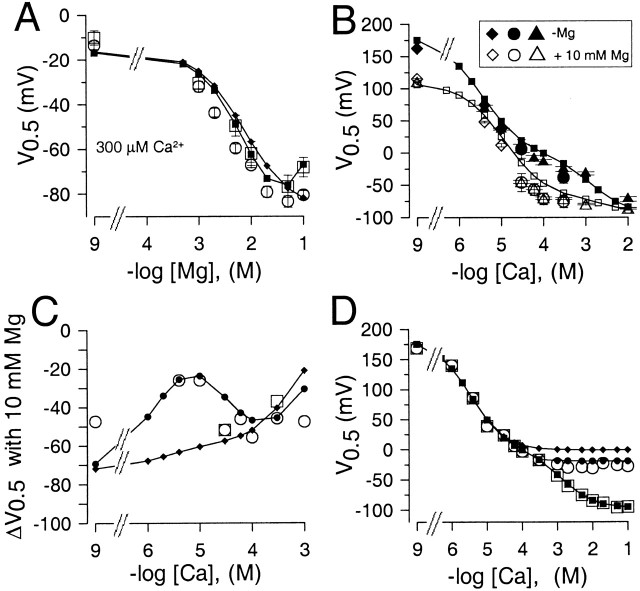 Figure 5. The ability of mM concentrations of Ca2+ and Mg2+ to shift G-V curves is similar. In A, the V0.5 for activation is plotted as a function of Mg2+ for G-V curves obtained in two separate sets of patches each activated by 300 μM Ca2+ plus the indicated Mg2+. The predictions for the shift in V0.5 as a function of Mg2+ based on two sets of fitted values for Fig. 1 (Table , columns A [♦] and D [▪]) are also displayed. In B, the ability of Mg2+ to shift V0.5 at different Ca2+ is displayed. Triangles show V0.5 values from macroscopic currents without (▴) or with (▵) 10 mM Mg2+. Circles ([•] no Mg2+; [○]: + 10 mM Mg2+) are means and SD for V0.5 determined from Po measurements from four patches with either one or two channels as in Fig. 3. Diamonds ([♦] no Mg2+;[⋄] +10 mM Mg2+) are values obtained with unbuffered Ca2+ solutions. Predictions from the fitted values for Fig. 1 (Table , column D) are also shown for Ca2+ alone (▪) and with 10 mM Mg2+ (□). In C, the change in V0.5 (ΔV0.5) produced by 10 mM Mg2+ at different [Ca2+] is displayed for macroscopic current measurements (○) and single-channel estimates (▪). Estimates of predicted ΔV0.5 based on a fit of Fig. 1 to G-V curves with or without Mg2+ are also shown for two cases: first, Mg2+ inhibition of the high affinity site is allowed (•; Table , column D) and no inhibition by Mg2+ occurs (♦; Table II; column F). In D, values of V0.5 obtained as a function of Ca2+ (□) are replotted along with estimates of the V0.5 corrected at Ca2+ of 1 mM and above by the additional shift produced by Mg2+ shown in A obtained with 300 μM Ca2+. These values (○) provide an indication of the ability of the higher affinity, Ca2+ selective site to shift activation of BK channels, in the absence of the low affinity effect, assuming that the high and low affinity effects are independent and additive. Predicted values for V0.5 based on a fit of Fig. 1 are also shown for the case of both low and high affinity Ca2+ binding sites (▪; Table II; column D), and also for Ca2+ action alone in the absence of a high affinity site (♦). The latter values were also corrected for the approximately −17-mV shift that 300 μM Ca2+ should produce by acting at the low affinity sites (•). The discrepancy between the Mg2+ corrected data and the prediction from Fig. 1 arises from the fact that the Mg2+ correction was obtained with solutions with 300 μM Ca2+ such that the effect of 300 μM Ca2+ on the low affinity site is not taken into account.