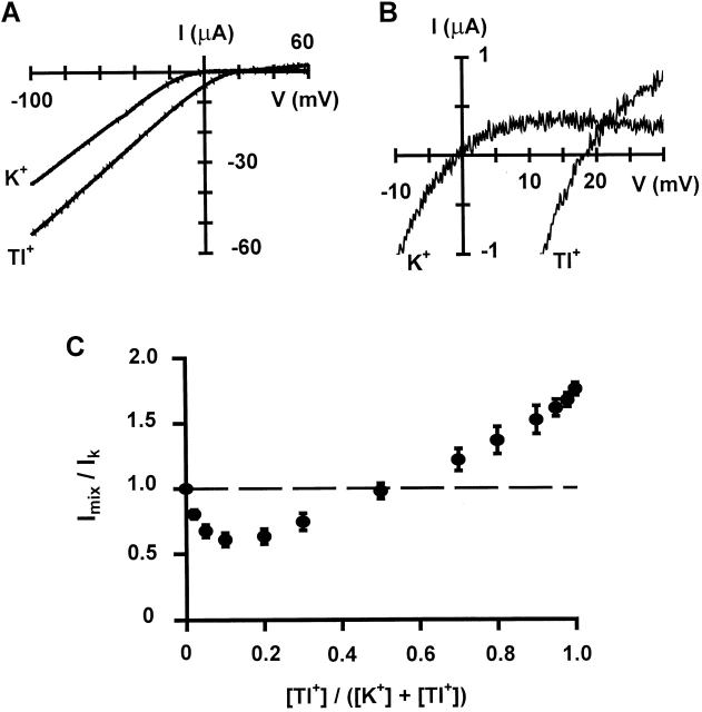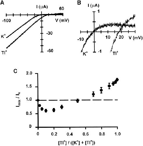 Figure 1. Permeation properties of Tl+ ions. (A) Whole-cell current-voltage relations of Kir2.1 channels recorded by TEVC with either K+ or Tl+ as the external permeant ion. (B) Close-up of A to show the outward current and reversal potential. (C) Relative whole-cell current recorded at −100 mV by TEVC in external solutions containing different concentrations of K+ and Tl+. The total concentration of both ions is 100 mM. Each data point is the average of four to eight measurements. Error bars are SD.