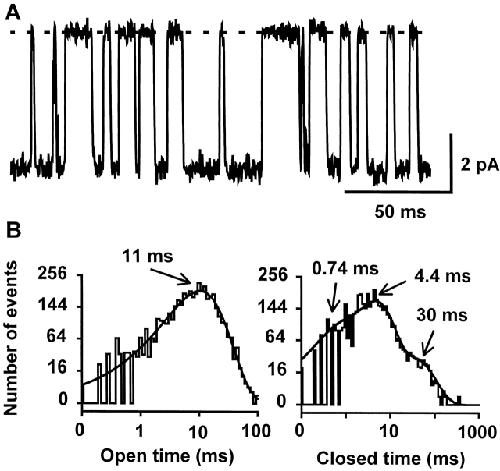 Figure 4. C169V mutation abolishes the slow decay of single-channel current and subconductance level. (A) Representative single-channel Tl+ currents recorded at −100 mV from a C169V mutant channel in a cell-attached membrane patch. Notice the lack of decay of single-channel current and subconductance level. (B) Open- and closed-time distributions of channels recorded with Tl+ as the external permeant ion. The open-time distribution was best fit by a single exponential and the closed-time distributions by three exponentials. The time constants of the fits are similar to those for the wild-type channel (Fig. 2 D).