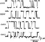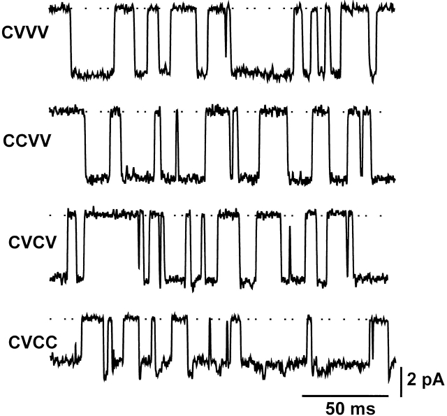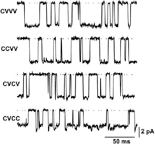 Figure 5. Tl+ must interact with three or four C169 thiolate groups to induce the slow decay of single-channel current and subconductance level. The traces show representative cell-attached single-channel Tl+ currents recorded at −100 mV from four different types of channels. The channels are formed by tandem tetramers containing one to three C169V mutant subunits: WT-C169V-C169V-C169V (CVVV), WT-WT-C169V-C169V (CCVV), WT-C169V-WT-C169V (CVCV), and WT-C169V-WT-WT (CVCC).