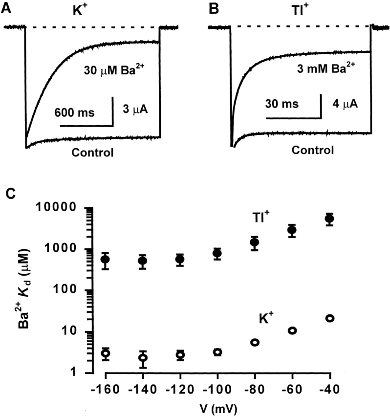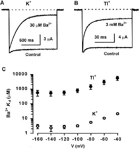 Figure 6. Comparison of Ba2+ blockage of K+ and Tl+ currents. (A and B) Blockage by external Ba2+ of whole-cell K+ (A) or Tl+ (B) current recorded by TEVC. Currents were recorded from the same oocyte and were evoked by a test pulse to −100 mV from a holding potential of 0 mV. The dashed lines indicate the zero current level. Notice the difference in time scale in the two figures. (C) Voltage dependence of the apparent Kd of Ba2+ with either K+ or Tl+ as the external permeant ion (n = 5–6).