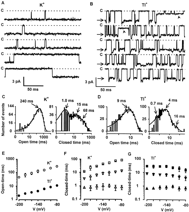 Figure 2. Alteration of single-channel gating by Tl+ ions. (A and B) Consecutive records of single-channel K+ (A) or Tl+ (B) currents recorded at −100 mV in a cell-attached membrane patch. The dashed lines indicate the closed level in this and all subsequent figures. Arrows in B indicate the dominant subconductance level and arrowheads mark a relatively rare subconductance level. (C and D) Open- and closed-time distributions of channels recorded with K+ (C) or Tl+ (D) as the external permeant ion. The open-time distributions were best fit by a single exponential and the closed-time distributions by three exponentials. The time constants of the fits are indicated. (E) Voltage dependence of the open-time with either K+ or Tl+ as the permeant ion (n = 4–6). (F and G) Voltage dependence of the closed times with either K+ (F) or Tl+ (G) as the permeant ion (n = 4–12). Error bars are SD and are smaller than the symbols in some cases.